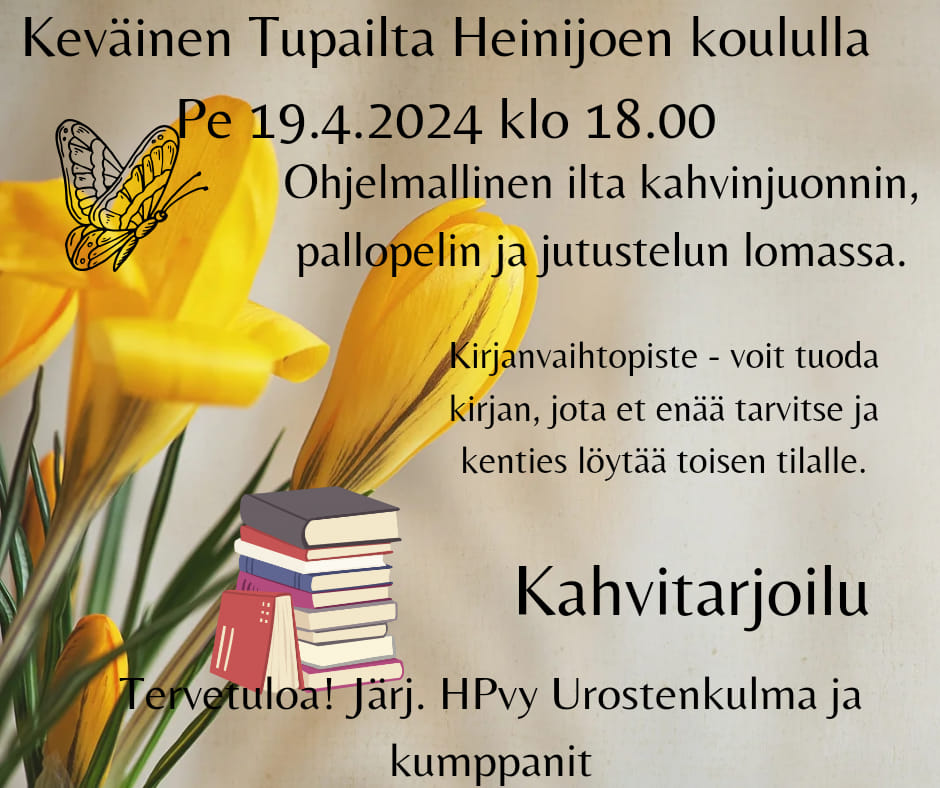 Keväinen tupailta Heinijoen koululla pe 19.4.2024 klo klo 18. Ohjelmallinen ilta kahvinjuonnin, pallopelin ja jutustelun lomassa. Kahvitarjoilu!